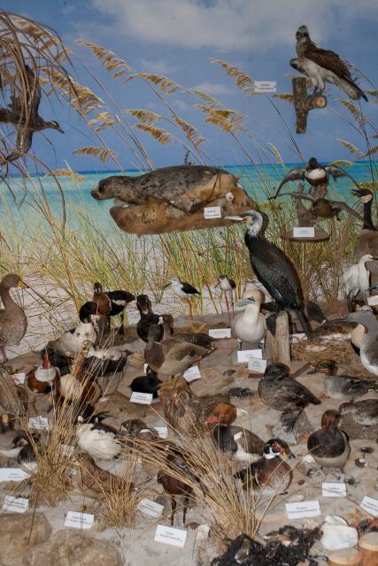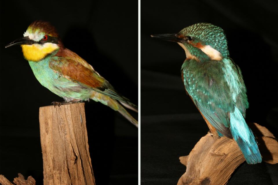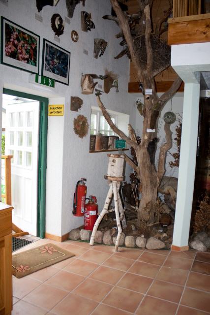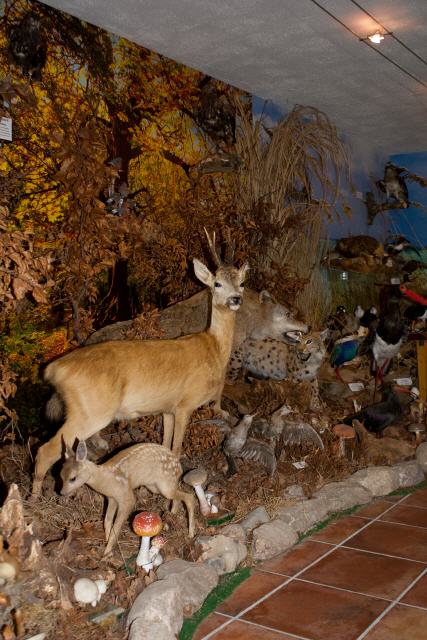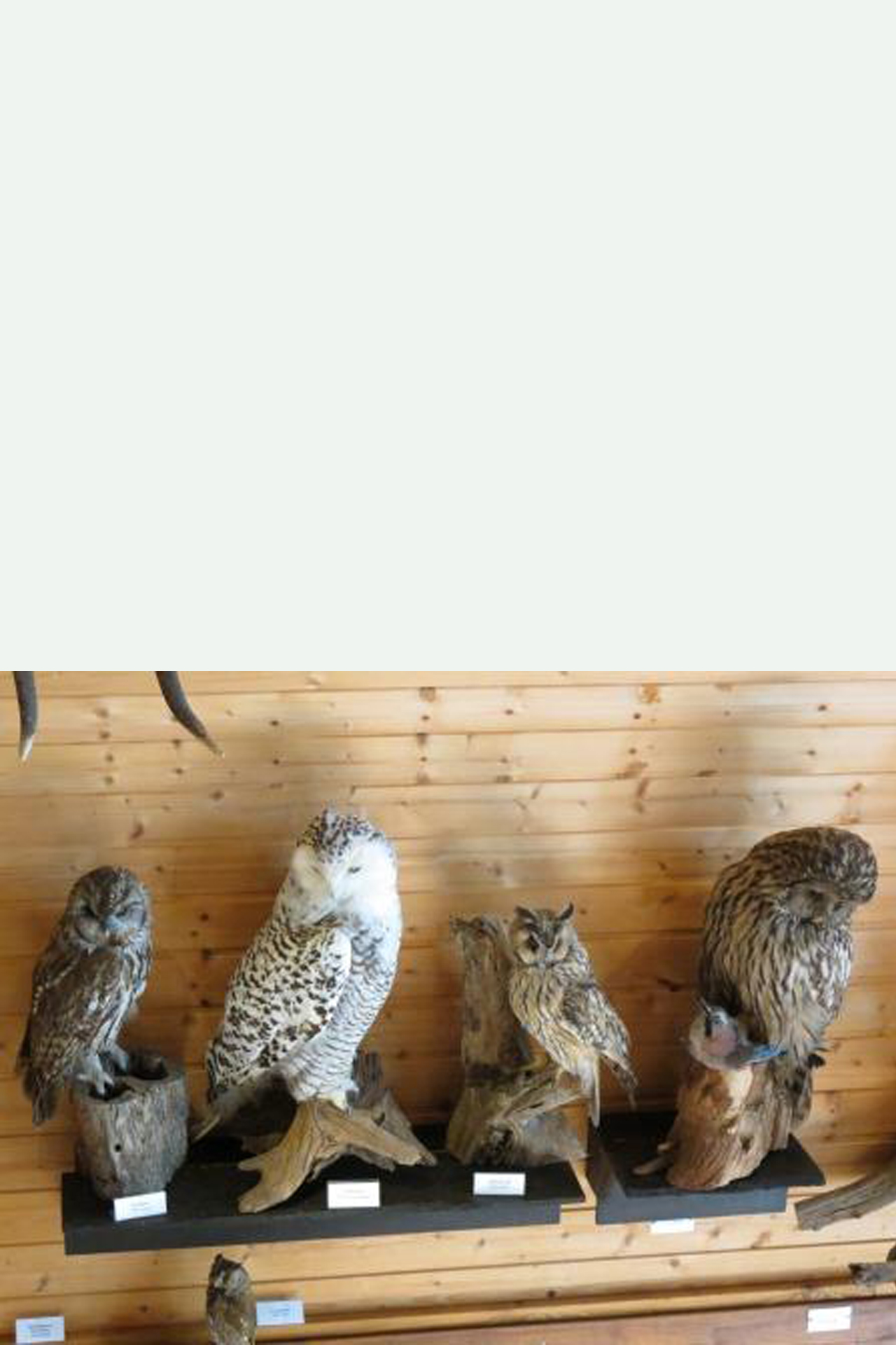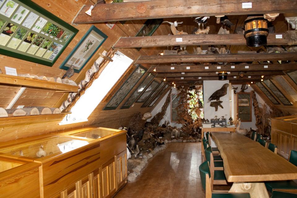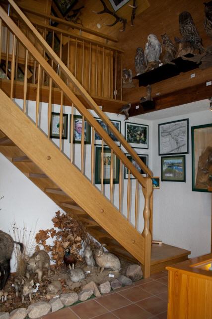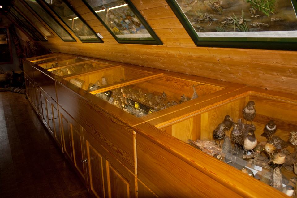 befinden sich mehrere Schaukästen mit heimischen Singvogelarten inklusive einiger Exoten wie z. B. dem Bienenfresser und der Blauracke. Ebenfalls in Schaukästen befindet sich einen im Aufbau befindliche Amphibiensammlung. Aus den verschiedenen heimischenRaubtierpräparaten ragt ein Albino Dachs als Besonderheit heraus. Das Gebälk gehört den Greifvögeln und Möwen.